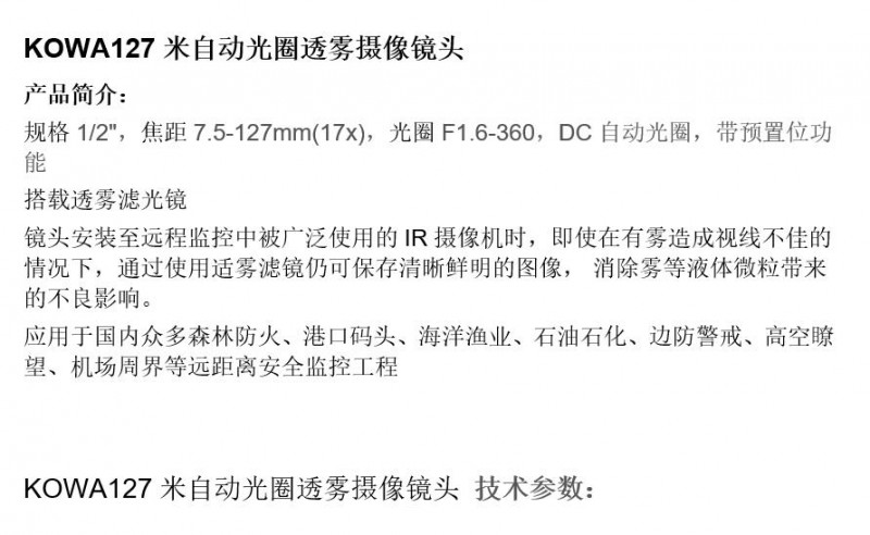 KOWA127mm自动光圈透雾安防摄像镜头