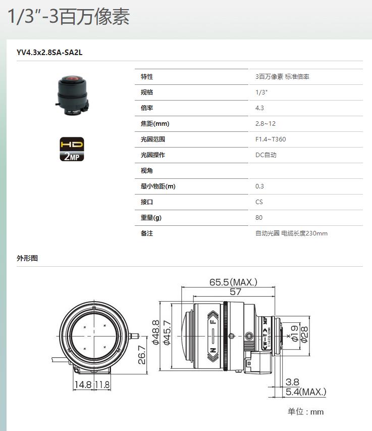 YV4.3x2.8SA-SA2L富士能高清手动变焦镜头